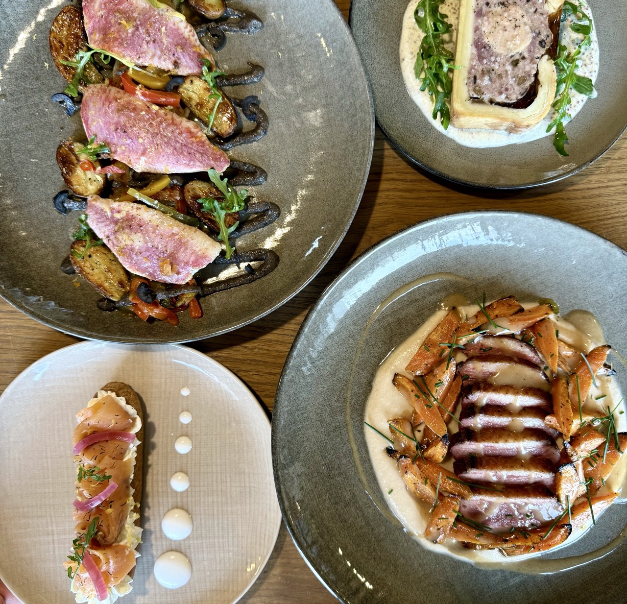 Filets de rouget grillé sur peau, tapenade crémeuse, piperade de légumes, pomme de terre